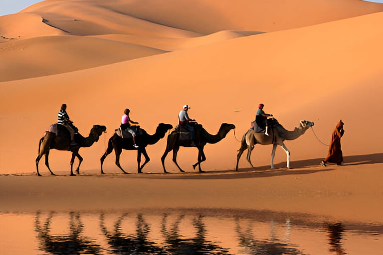 Llegada a la tierra del desierto, paseo en camello cruzando las dunas con hermosas puestas de sol y amaneceres pasar la noche en campamento de lujo