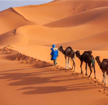 Le désert : Arrivée dans le désert, promenade à dos de chameau à travers les dunes avec de magnifiques couchers et levers de soleil, nuit dans un camp de luxe