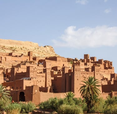 Viagem ao património cinematográfico e arquitetónico de Marrocos. Explore a fortaleza de barro de Aït Benhaddou, Património Mundial da UNESCO e cenário de filmes como Gladiador e Game of Thrones, muitas vezes acompanhado por um passeio panorâmico pelas montanhas do Alto Atlas até Ouarzazate