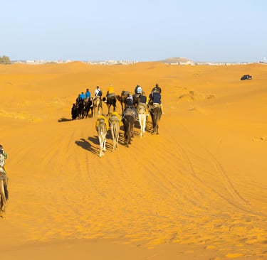 Arrive at Merzouga, ride camels to the desert camp, and enjoy sunset over the dunes