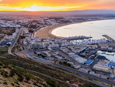 Agadir is Morocco’s modern seaside city, famous for its wide sandy beaches, mild climate, and relaxed atmosphere. Rebuilt after the 1960 earthquake, Agadir offers a unique blend of modern comforts and natural beauty. Stroll along the beachfront promenade, explore the bustling marina, or relax at one of the many beachfront cafés. For adventure seekers, Agadir is a gateway to surfing spots, the scenic Paradise Valley, and the nearby Souss-Massa National Park. Whether you’re looking to unwind or explore, Agadir offers the perfect balance of leisure and discovery by the Atlantic coast