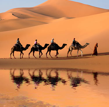 Llegada a la tierra del desierto, paseo en camello cruzando las dunas con hermosas puestas de sol y amaneceres pasar la noche en campamento de lujo