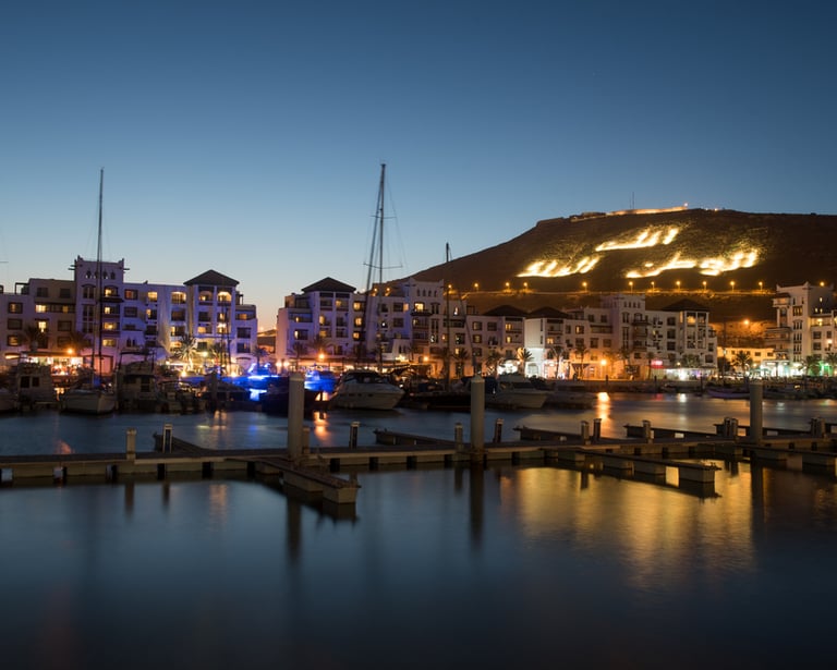 Agadir es la ciudad costera moderna de Marruecos, famosa por sus amplias playas de arena, clima templado y ambiente relajado. Reconstruida tras el terremoto de 1960, Agadir ofrece una mezcla única de comodidades modernas y belleza natural. Pasea por el paseo marítimo, explora la animada marina o relájate en uno de los muchos cafés frente al mar.